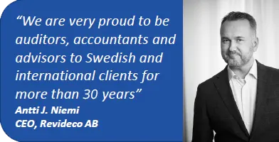 The intended use of this booklet ‘A Guide to Dooing Business in Sweden’ is to provide general guidance only. Revideco AB is not responsible for potential errors or omissions in the booklet. Our recommendation is to contact us for professional advice concerning specific situations if needed.